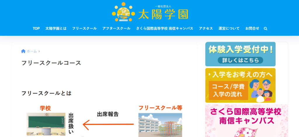 | 公式サイト | フリースクールコース – 一般社団法人 太陽学園 |