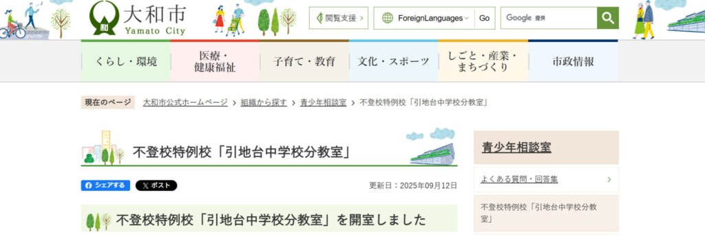 大和市では、市立の教育支援教室「まほろば教室」や不登校特例校「引地台中学校分教室」を設置し、公的に子どもを支える体制を整えています。