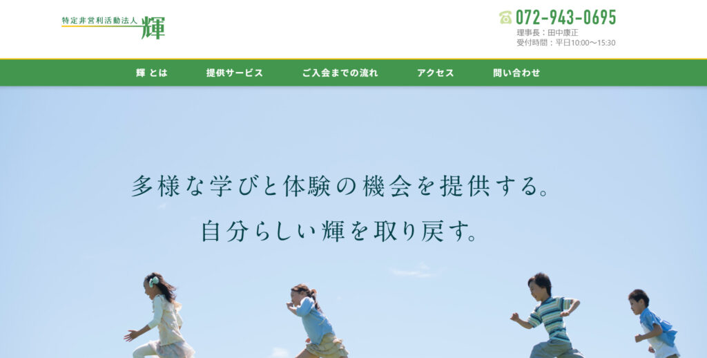 特定非営利活動法人 輝は、「多様な学びと体験を通じて、自分らしい輝きを取り戻す」を理念に掲げます。 お子さん一人ひとりの個性を尊重し、自己肯定感を丁寧に育むという温かいメッセージです。 本来の自分を取り戻せる、安心できる環境作りを大切にしています。